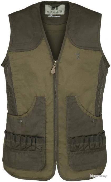 Gilet de chasse Savane de Percussion en toile 80% polyester et 20% coton, filet d’aération sur les côtés en 100% polyester. Renforts aux épaules, 2 grandes poches basses fermées par boutons pressions, cartouchières extérieures 18 tubes, poches intérieures dont une poche pour téléphone portable, anneau porte-gibier, carnier doublé PVC.
